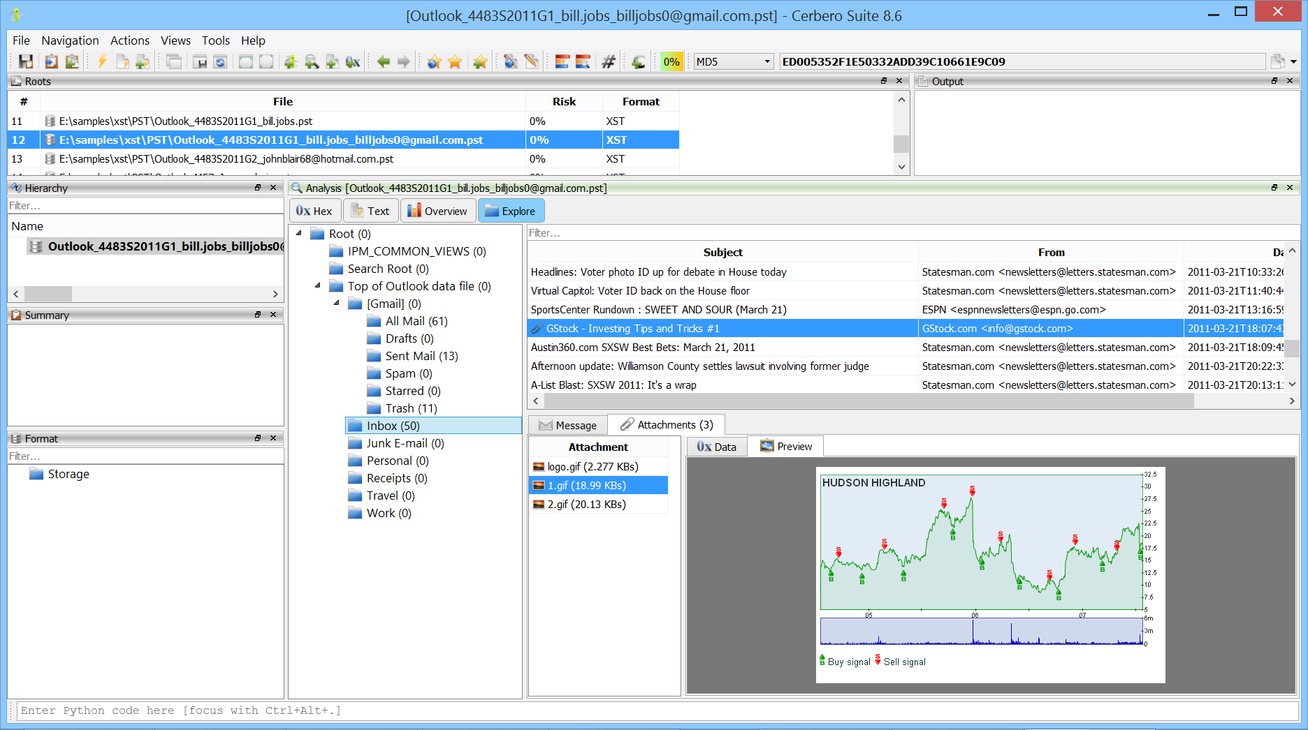 The package makes it possible to explore every part of an email container, including messages, folder structures, metadata and attachments.